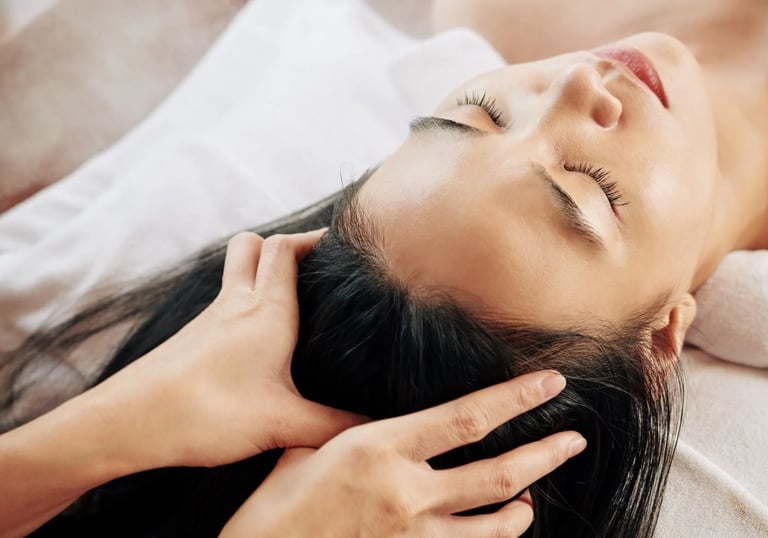 Nourishing oils and scalp massage improving hair health, reducing stress and relieving mental fatigue.